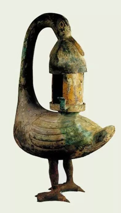 能擋風,又可調節燈光亮度,燈火點燃時,煙霧通過魚腹和雁頸導入雁腹,