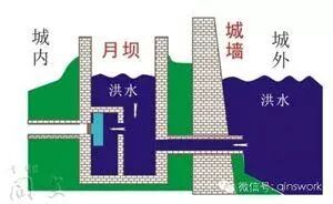 月壩是非常簡便有效的防洪系統:圖裡藍色的T形物體是個大木頭塞,在洪