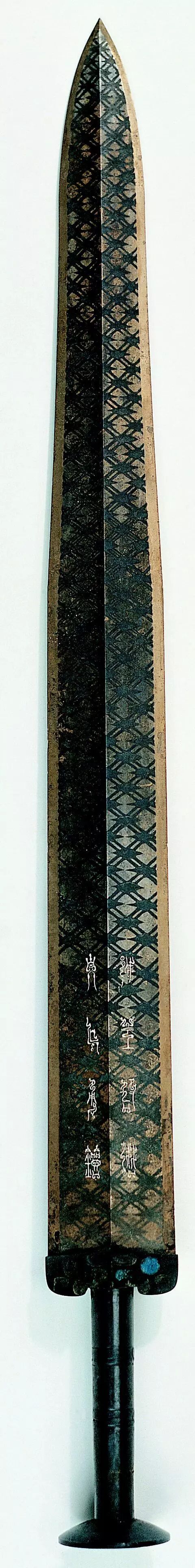 劍身滿飾黑色菱形幾何暗格花紋,劍格兩面還分別用藍色琉璃和綠松石鑲嵌