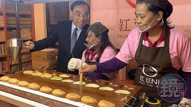 法務部部長蔡清祥和「紅豆NI」收容人學員一起做紅豆餅。
