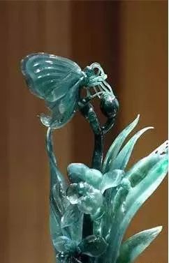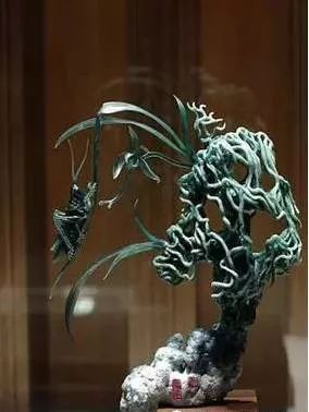翡翠白菜兩顆,綠色的菜葉旁有兩隻典色的馬蜂。