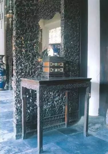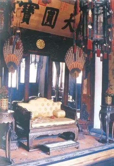 地屏寶座,後置五扇紫檀木嵌壽字鏡心屏風,上懸“大圓寶鏡”匾。