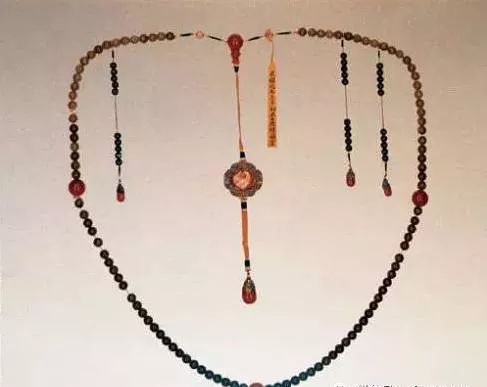 脖頸上有朝珠三掛,兩掛是珍珠的,一掛是紅寶石的。