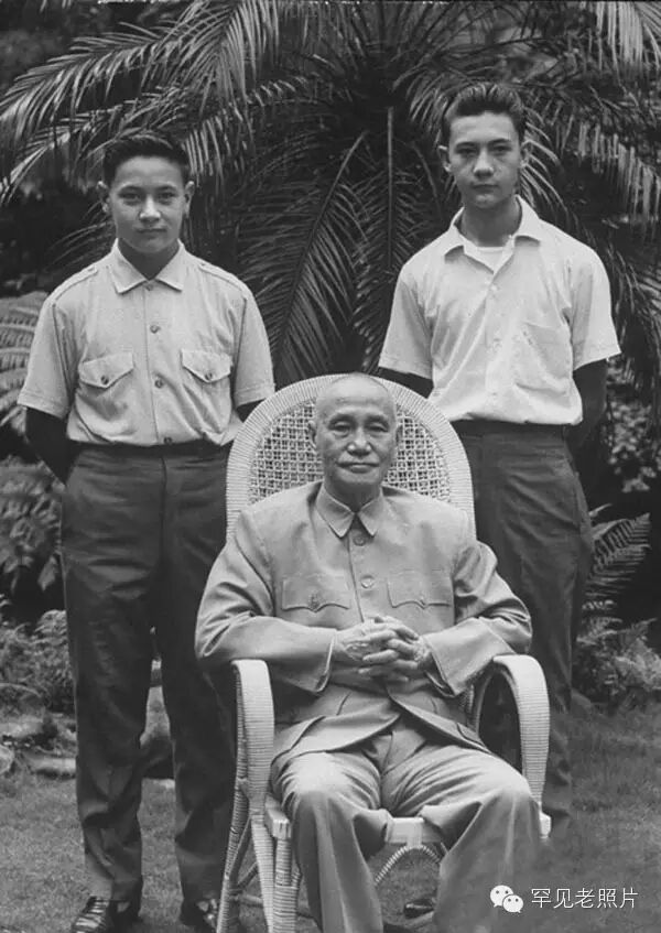 1947年4月,蔣介石、宋美齡與蔣經國全家在浙江奉化溪口合影。
