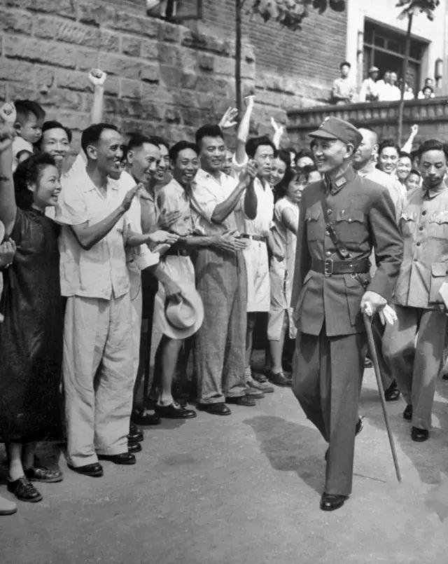 1945年9月,重慶,慶祝抗戰勝利,蔣介石穿著軍裝與市民同慶。傑克·威爾克斯/攝。