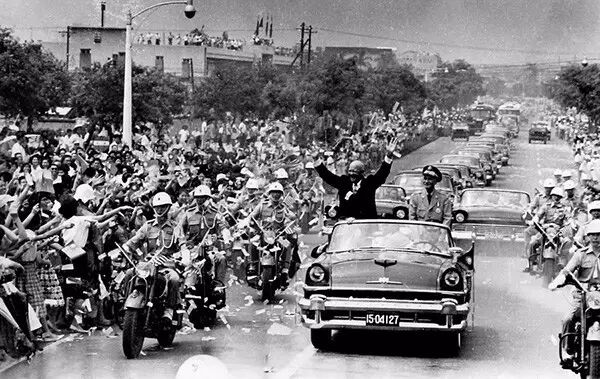 1960年6月18日,艾森豪威爾總統訪台時與蔣介石搭敞篷車接受群眾夾道歡迎。