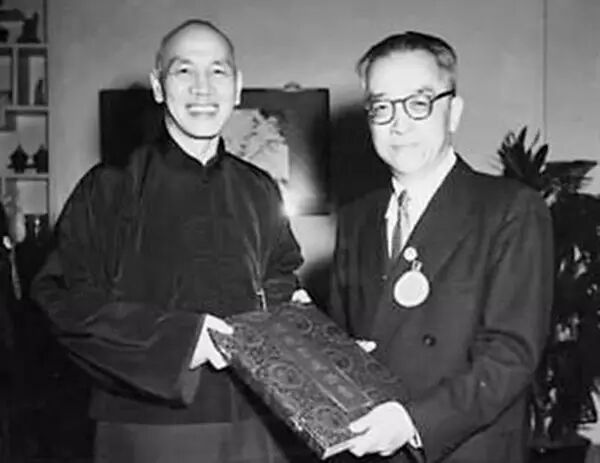 1954年,蔣介石當選中華民國第二任總統,胡適致送當選總統證書。