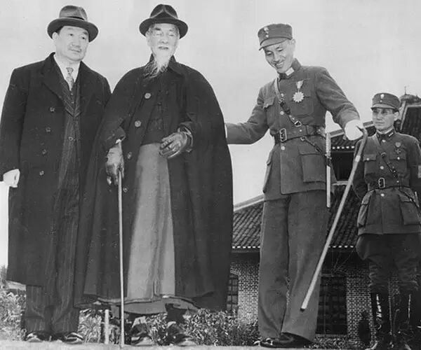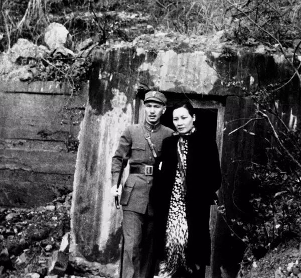 日軍空襲後,在重慶的蔣介石夫婦走出防空洞。照片大約拍攝於1940-1941年。