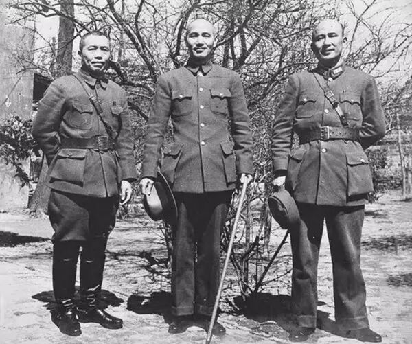 1938年3月24日,白崇禧(右一)陪同蔣介石視察徐州時與第五戰區司令長官