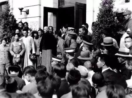 1934年1月,學生包圍國民黨中央黨部,要求與蔣介石對話,身穿馬褂的蔣介石