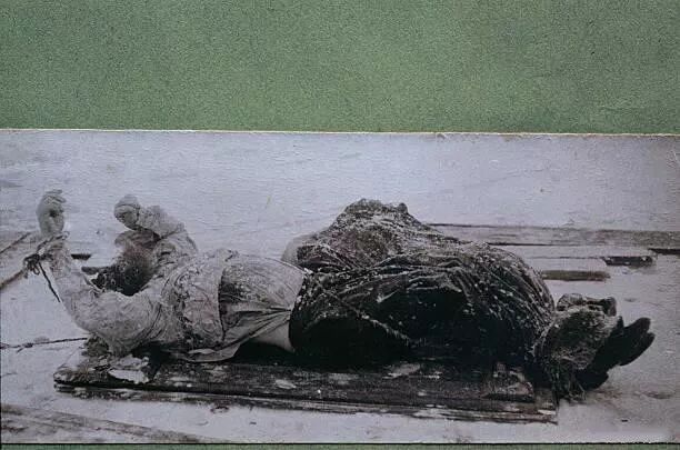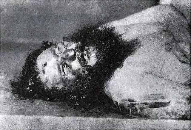 再度擊昏。圖為拉斯普京的屍體,額頭的槍孔、啞鈴的砸傷歷歷