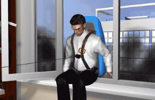 然後坐在窗戶邊,用力拉下背包上的充氣啟動環,背包就會立刻打開充氣,